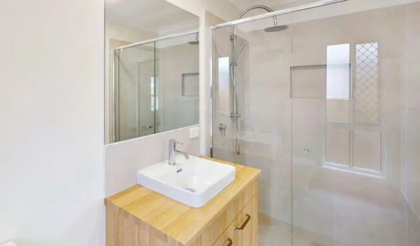 Ensuite bathroom includes a spacious dual operational shower with glass door. Toilet, wall hung vanity and full width mirror.
